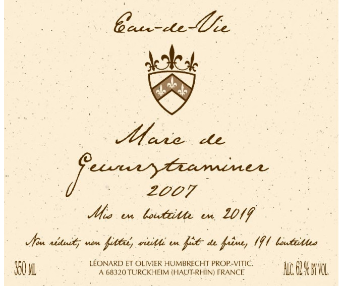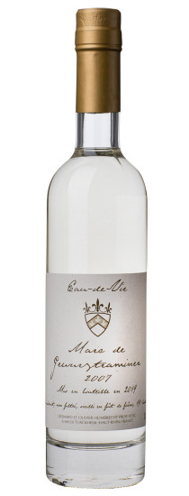 Ce marcs de Gewurztraminer a été distillé à partir des propres marcs du Domaine. La production n’est pas régulière, car le domaine ne distille que les années favorables, lorsque les raisins sont récoltés très sains. La pourriture noble en effet peut être intéressante pour la production de vins de vendanges tardives, mais altère l’expression aromatique des produits de distillation.